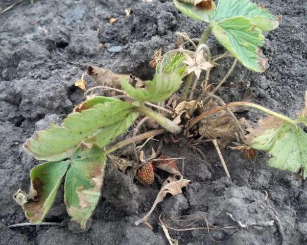 Μπορείτε να αναγνωρίσετε τη σήψη της ρίζας των φραουλών με το μαυρίσματος των φύλλων και το μαρασμό του στελέχους.