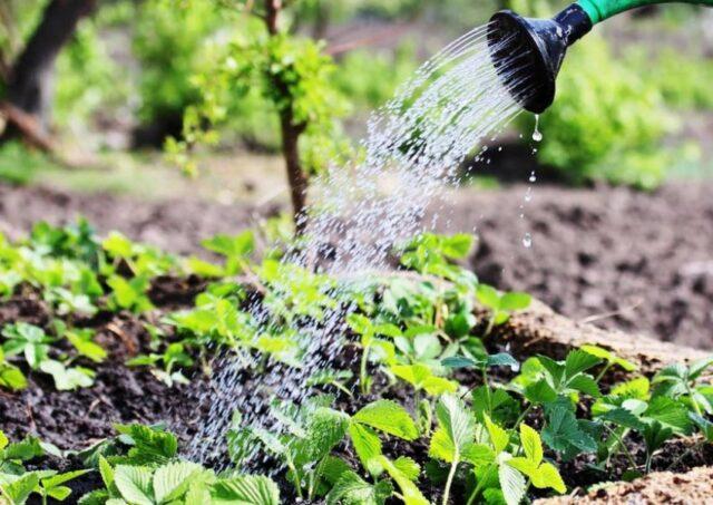 - Τακτικό πότισμα του εδάφους. Το ριζικό σύστημα των βρετανικών φραουλών είναι κοντά στην επιφάνεια, έτσι στεγνώνει πολύ γρήγορα τις ξηρές ημέρες. Για συνεχή άρδευση, μπορείτε να κανονίσετε ένα σύστημα στάγδην άρδευσης. Εάν αυτό δεν είναι δυνατό, τότε τις ζεστές μέρες, οι φράουλες ποτίζονται καθημερινά. Για 1 m² εμβαδού, απαιτούνται 7-10 λίτρα νερού. Σε συννεφιασμένες μέρες (χωρίς καθίζηση), 5-6 λίτρα είναι αρκετά για την ίδια περιοχή. Την άνοιξη και κατά τη διάρκεια της δροσερής περιόδου - τρία υγρασία του εδάφους την εβδομάδα, 5 λίτρα ανά 1 m². Εάν βρέξει, το πότισμα σταματά. Κατά τη διάρκεια της ανθοφορίας, οι φράουλες στο Ηνωμένο Βασίλειο ποτίζονται καλύτερα νωρίς το πρωί.