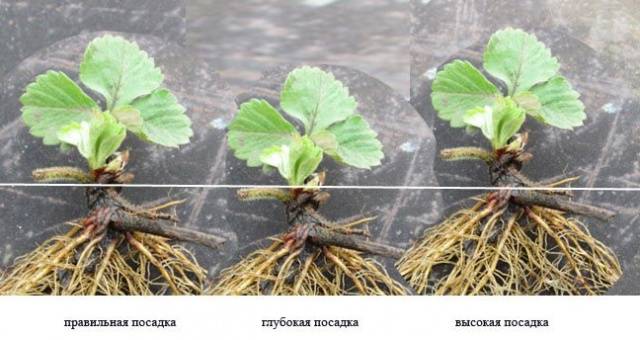 Αφού σπάσετε τις σειρές για κάθε σπορόφυτο φράουλας, σκάψτε μια τρύπα. Η πλήρωση γίνεται με χαλαρό χώμα στο επίπεδο της κορυφής του μπουμπούκι. Είναι σημαντικό να διασφαλιστεί ότι δεν θα παραμείνουν γυμνές ρίζες.