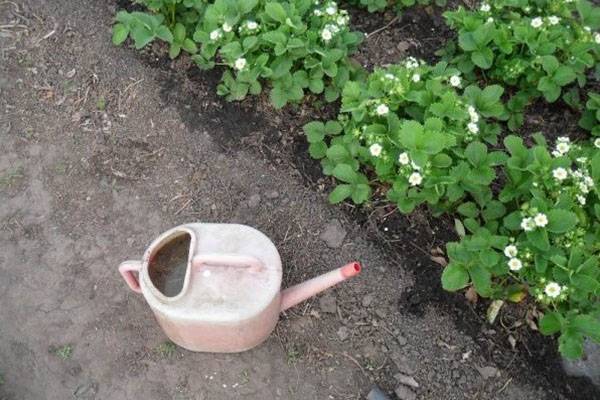 Την άνοιξη, αφού λιώσει το χιόνι, τα κρεβάτια τακτοποιούνται.Αφαιρούν το παλιό φύλλωμα, χαλαρώνουν τους διαδρόμους. Το πότισμα γίνεται με ζεστό νερό, προσθέτοντας 1 g θειικού χαλκού ή την ίδια ποσότητα υπερμαγγανικού καλίου σε 1 κουβά. Με την εμφάνιση των ωοθηκών, οι φράουλες ποτίζονται με διάλυμα βορικού οξέος με ρυθμό 5 g σκόνης ανά 10 λίτρα νερού.