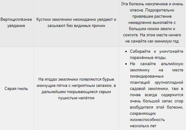 Η επισκευή της αλπικής ποικιλίας είναι ανθεκτική σε ασθένειες, αλλά κατά τη διάρκεια μιας επιδημίας μπορούν να εκδηλωθούν. Οι πιο επικίνδυνες ασθένειες και μέθοδοι ελέγχου παρουσιάζονται στον πίνακα.
