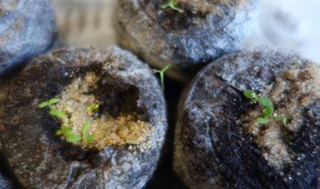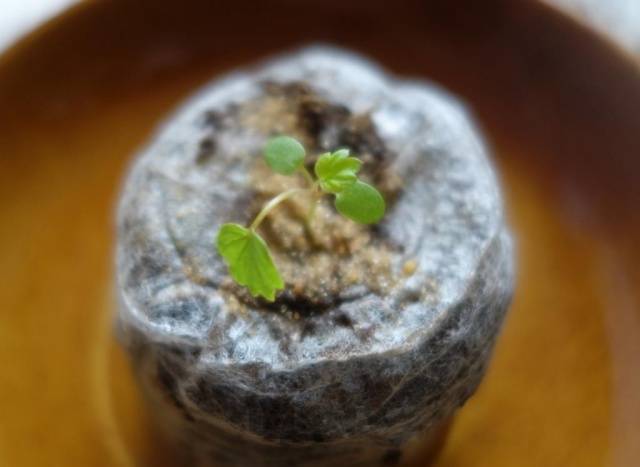 - Οι ροδέλες τύρφης τοποθετούνται σε πλαστικό δοχείο. Ρίχνουμε λιωμένο ή καταβυθισμένο νερό, όπου μια πρέζα Fitosporin διαλύεται προκαταρκτικά. Μετά το πλύσιμο τύρφης, οι φωλιές φύτευσης καλύπτονται με χώμα.