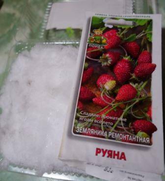 - Το εύφορο έδαφος πυρώνεται στο φούρνο, ψύχεται σε θερμοκρασία δωματίου και διασκορπίζεται σε ένα δίσκο. Ένα στρώμα χιονιού πάχους 1 cm χύνεται στην κορυφή. Τα τσιμπιδάκια χρειάζονται για την τοποθέτηση μικρών κόκκων. Κάθε σπόρος του υπολείμματος φράουλας του Ruyan τοποθετείται στο χιόνι, παρατηρώντας ένα διάστημα 1 εκατοστού μεταξύ τους. Η παλέτα καλύπτεται με μια διαφανή μεμβράνη, τοποθετείται στο ψυγείο για τρεις ημέρες. Μετά από αυτό το διάστημα, οι καλλιέργειες αφαιρούνται και τοποθετούνται σε ένα ζεστό δωμάτιο. Η ταινία αφαιρείται μόνο μετά την εμφάνιση των δενδρυλλίων.
