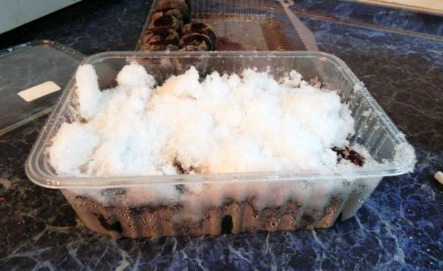 - Η στρωματοποίηση με το χιόνι θεωρείται η πιο αποτελεσματική. Ένα στρώμα χιονιού (4-5 cm) χύνεται στο έτοιμο έδαφος. Οι σπόροι απλώνονται σε αυτό σε βήματα του 1 cm και τοποθετούνται στο ψυγείο. Το χιόνι θα λιώσει και θα τραβήξει τους σπόρους στο επιθυμητό βάθος. Μετά από 3 ημέρες, το δοχείο εκτίθεται σε ένα ηλιόλουστο παράθυρο.