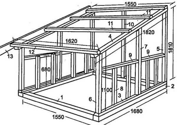 Είναι δύσκολο για ένα άπειρο άτομο να καταρτίσει ένα σχέδιο από ένα μπλοκ χρησιμότητας. Αυτή η φωτογραφία προτείνει ένα έργο υπόστεγο πλαισίου με στέγη αετωμάτων. Συλλέξτε το σύμφωνα με τις καθορισμένες διαστάσεις, εάν σας ταιριάζουν οι διαστάσεις ενός τέτοιου κτιρίου.