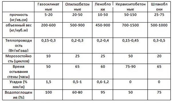 Πρόσφατα, για την κατασκευή υπόστεγων, μπλοκ αφρού έχουν αρχίσει να χρησιμοποιούνται συχνότερα από τούβλα. Η δημοτικότητα του υλικού οφείλεται στο χαμηλό βάρος, την καλή απόδοση θερμομόνωσης και την ικανότητα "αναπνοής". Τα μπλοκ αφρού είναι μεγαλύτερα από το μέγεθος των τούβλων, γεγονός που επιταχύνει τη διαδικασία τοποθέτησης των τοίχων του αχυρώνα. Πρέπει να σημειωθεί ότι τα τεμάχια έχουν διάφορες ποικιλίες που διαφέρουν στη σύνθεσή τους. Τα χαρακτηριστικά του υλικού φαίνονται στον πίνακα.