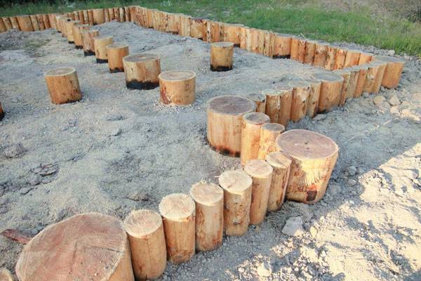 - Οι τρύπες σκάβονται κάτω από τα αρχεία καταγραφής. Ο πυθμένας καλύπτεται με στρώση θρυμματισμένης πέτρας ή χαλικιού 150 mm. Όλα τα κούτσουρα εγκαθίστανται στις τρύπες, μετά τις οποίες τα κενά απλώς ωθούνται με χώμα. Επιτρέπεται να γεμίσετε τα λάκκα με σκυρόδεμα ή να τα γεμίσετε με ξηρό μείγμα άμμου και τσιμέντου.