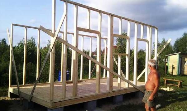 Λοιπόν, ήρθε η ώρα να αρχίσετε να χτίζετε το ίδιο το υπόστεγο. Η τεχνολογία πλαισίου είναι πιο αποδεκτή για τέτοια κτίρια χωρών. Είναι βέλτιστο να προτιμάτε το μέγεθος του μπλοκ χρησιμότητας 6x3 μ. Είναι πιο εύκολο να φτιάξετε μια μονή σκεπή. Για να πάρει μια κλίση, ο μπροστινός τοίχος έχει ύψος 3 m και ο πίσω τοίχος 2,4 m.