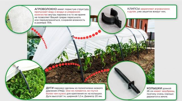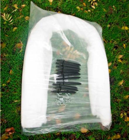 - Η βολική εγκατάσταση τόξων στο έδαφος παρέχεται από πλαστικές στοίβες μήκους 26 εκ. Ένας εφεδρικός πείρος περιλαμβάνεται πάντα στο κιτ. Ας υποθέσουμε ότι ένα Snowdrop μήκους 6 μέτρων έχει 7 τόξα και ολοκληρώνεται με 15 πονταρίσματα.