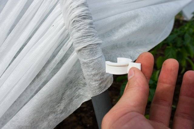 - Μετά την εγκατάσταση όλων των τόξων, το υλικό κάλυψης απλώνεται στον σκελετό. Θα πρέπει να είναι ελαφρώς τεντωμένο χωρίς χαλάρωση ή τσαλάκωμα. Στις καμάρες, το spunbond στερεώνεται με πλαστικά κλιπ. Στο μέλλον, θα προσφέρουν την ευκολία ανοίγματος των πλευρών του θερμοκηπίου για συντήρηση φυτών.