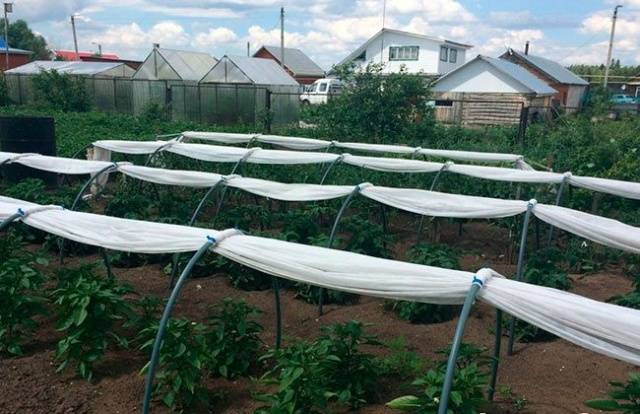 Για την περαιτέρω διευθέτηση του θερμοκηπίου, μπορείτε να χρησιμοποιήσετε πολλές συμβουλές. Ας υποθέσουμε ότι οι ακραίες άκρες του spunbond, δεμένες σε κόμπο, πιέζονται καλύτερα στο έδαφος υπό γωνία. Αυτό θα παρέχει επιπλέον τέντωμα του υλικού κάλυψης σε ολόκληρο το πλαίσιο. Από τη μία πλευρά της δομής, το spunbond πιέζεται στο έδαφος με ένα φορτίο, και από την άλλη πλευρά, ο καμβάς θα κρατηθεί μόνο σε κλιπ. Τα φυτά θα φροντιστούν από εδώ.