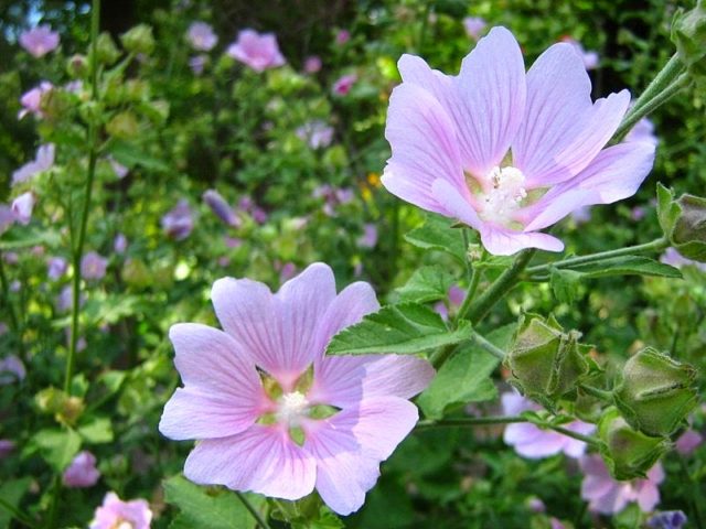 Το Lavatera Thuringian είναι ενδιαφέρον για τα ασυνήθιστα λουλούδια του με πέντε συμμετρικά πέταλα σε σχήμα καρδιάς