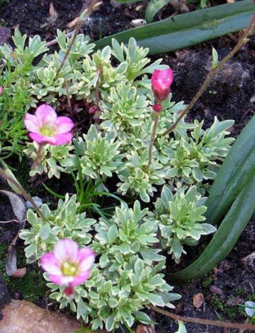 Ένα χαρακτηριστικό της ποικιλίας είναι ένα ανοιχτό κίτρινο περίγραμμα κατά μήκος της άκρης των φύλλων. Το ύψος του σαξόφωτου Arends Variegat φτάνει τα 20 εκ. Τα άνθη είναι ροζ έως 1 εκατοστό σε διάμετρο και υψώνονται πάνω από το φύλλωμα. Η περίοδος ανθοφορίας αρχίζει στα μέσα Ιουνίου.