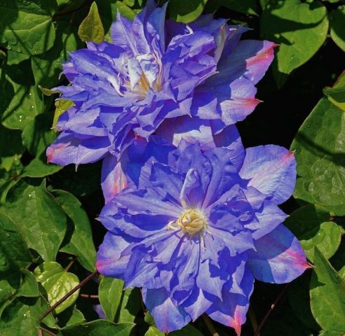 Τα λουλούδια του Clematis Blue Exploded είναι μεγάλα διπλά ή ημι-διπλά σε παλιά βλαστάρια, απλά σε νεαρά κλαδιά, διαμέτρου 15 εκατοστών, το σχήμα είναι μισό-ανοιχτό, το χρώμα των πετάλων είναι μπλε με ροζ άκρες.