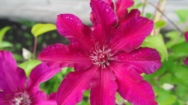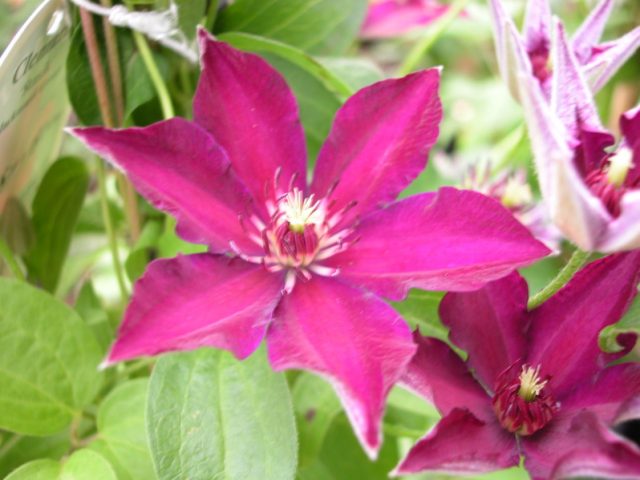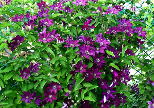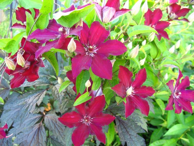 Οι ανθήρες των λουλουδιών clematis είναι σκούροι, με μοβ απόχρωση.