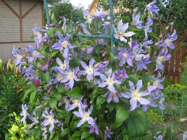Τα άνθη του φυτού είναι αρκετά μεγάλα, η διάμετρος τους είναι από 10 έως 12 cm, η οποία αμέσως τραβά το μάτι, δεδομένου του πολύ λεπτού στελέχους. Τα λουλούδια ανοίγουν πολύ φαρδιά, με τα σέπαλα να αλληλοεπικαλύπτονται μερικώς, γεγονός που ενισχύει περαιτέρω την εμφάνιση και την εντύπωση τους. Φαίνεται ότι σχεδόν ολόκληρη η επιφάνεια του αναρριχητικού θάμνου καλύπτεται με λουλούδια.