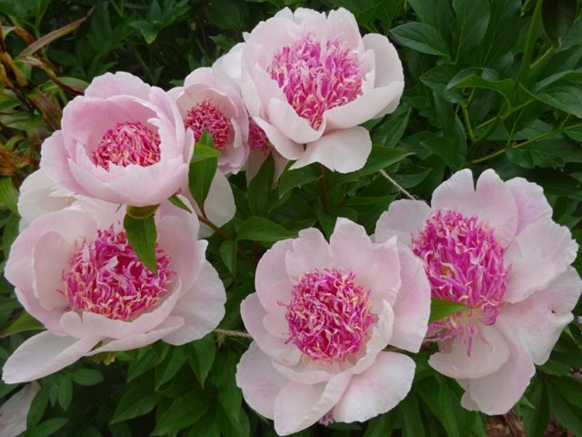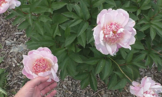 - Τα φύλλα Peony είναι μεγάλα, σκούρα πράσινα, λαμπερά, τεμαχισμένα, ελαφρώς κυματοειδή. Δίνουν στον θάμνο ένα διακοσμητικό αποτέλεσμα ισοδύναμο με λουλούδια. Είναι ιδιαίτερα ελκυστικά όταν τελειώσει η περίοδος ανθοφορίας. Το φθινόπωρο, είναι βαμμένα με κόκκινο μπορντό, μερικές φορές με μοβ απόχρωση.