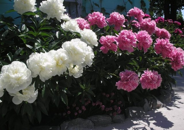 Είναι καλό να διακοσμήσετε μικρές περιοχές με ένα παρτέρι από τριαντάφυλλα και παιώνιες. Την άνοιξη, μπορείτε να προσθέσετε τυχόν βολβοειδή εποχιακά λουλούδια σε αυτά. Έτσι, το παρτέρι δεν θα φαίνεται άδειο. Οι παιώνιες πάνε καλά με τουλίπες. Αφού ολοκληρωθεί η ανθοφορία, τα αστέρια, τα χρυσάνθεμα, τα φλοξ, τα κρίνα, οι πετούνιες και οι βούρτσες αστέλ θα φαίνονται κατάλληλα στο πλαίσιο του φυλλώματος.