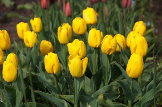 Η πλούσια ανθοφορία κίτρινων τουλιπών με μεγάλα ποτήρια και πλούσιο χρώμα πετάλων επιτυγχάνεται τοποθετώντας τα σε εύφορο έδαφος. Μια σοδειά που αναπτύσσεται ενεργά για μόλις 3,5 μήνες διαθέτει καλή διατροφή με επαρκή γονιμοποίηση.