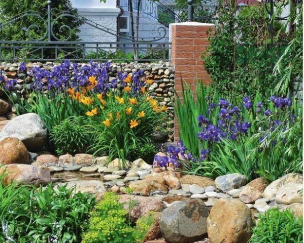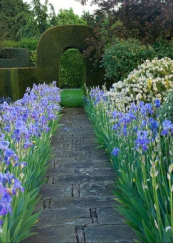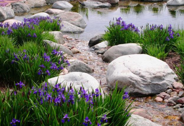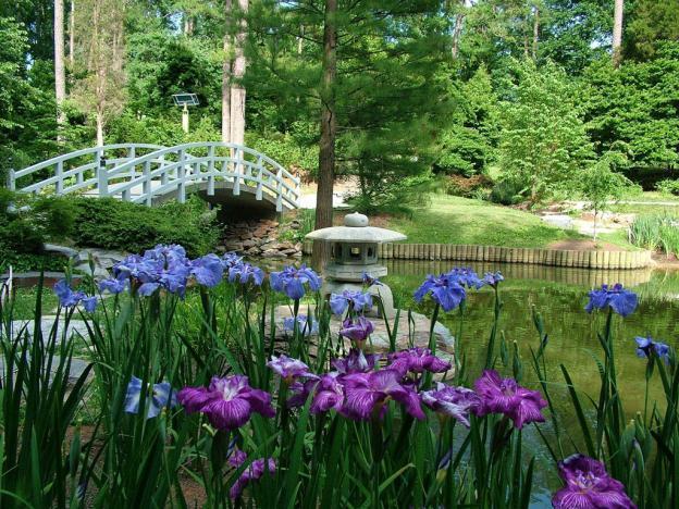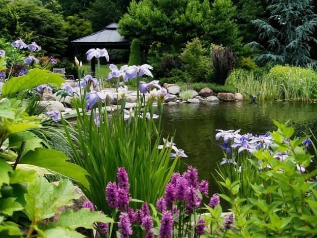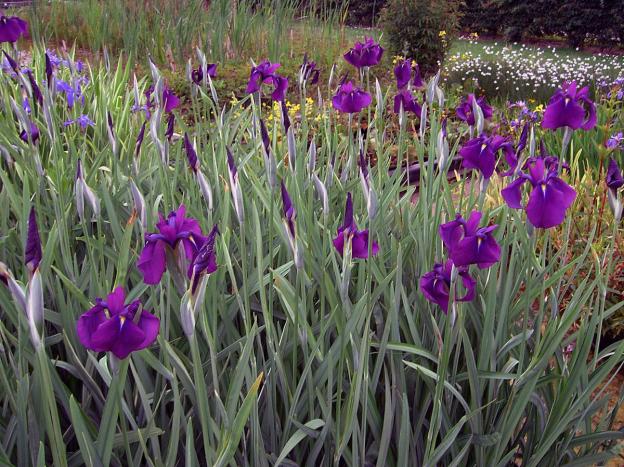 Οι ιαπωνικές ίριδες τονίζουν ευνοϊκά τους αειθαλείς θάμνους και τα μικρότερα ανθισμένα φυτά