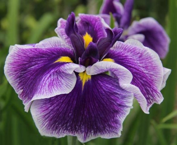 Η ποικιλία των ιαπωνικών ίριδων Variegata είναι μεσαίου μεγέθους, το ύψος της είναι περίπου 70 cm.Φύλλωμα σε όλο το στέλεχος, τα φύλλα είναι στενά, μακριά, με αιχμηρές κορυφές, ανοιχτό πράσινο με μπεζ ρίγες. Το χρώμα των φύλλων δεν αλλάζει από την αρχή της καλλιεργητικής περιόδου έως το φθινόπωρο. Τα λουλούδια είναι μεγάλα - διαμέτρου έως 30 cm, φωτεινά μοβ με κόκκινη απόχρωση στο φως της ημέρας, υπάρχει ένα πορτοκαλί έμπλαστρο στη βάση των πετάλων. Η ποικιλία των ιαπωνικών ίριδων ανθίζει τον Ιούλιο, διάρκεια - 14 ημέρες. Το φυτό που αγαπά το φως προτιμά το υγρό έδαφος.