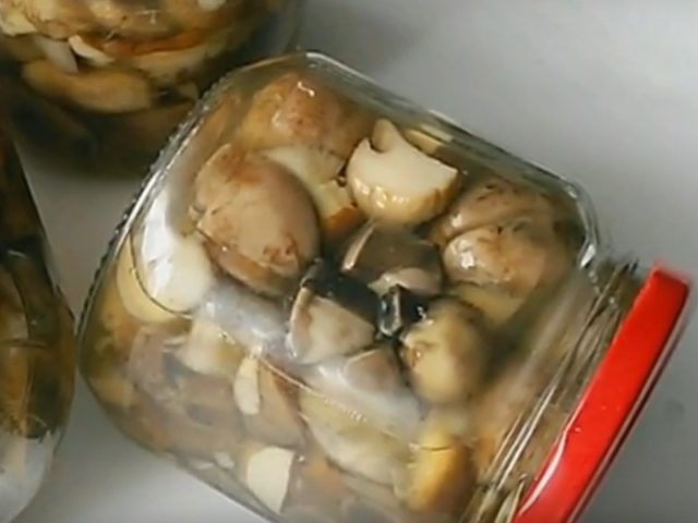 - Τακτοποιήστε τα βρασμένα μανιτάρια σε βάζα και ρίξτε βραστό μαρινάρισμα στην κορυφή, τυλίξτε σφιχτά, τυλίξτε και αφήστε το να κρυώσει.