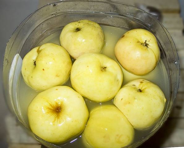 Πλύνετε τα μήλα, βάλτε τα σφιχτά σε γυάλινα δοχεία, γεμίστε τα με αλατόνερο στην κορυφή, σφραγίστε τα με νάιλον πώματα.