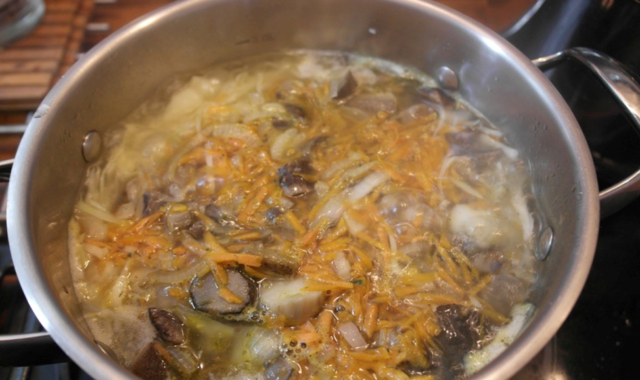 - Στο ζωμό προστίθενται πατάτες και φέτες μανιταριών. Βράζουμε για 15 λεπτά.