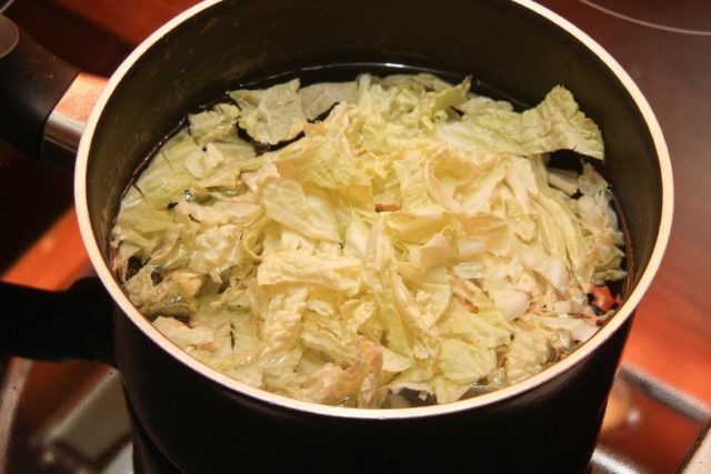 - Κόψτε το κινεζικό λάχανο (θα πρέπει να φτιάξετε λεπτά χυλοπίτες). Ρίχνουμε σε ζωμό μανιταριών.