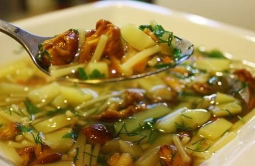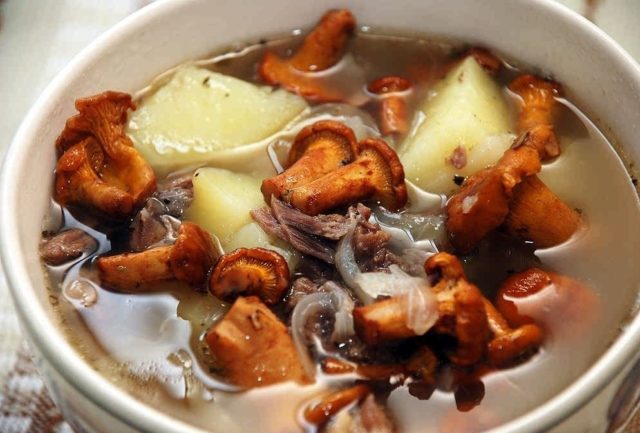 Οι σούπες Chanterelle βράζονται σε ζωμό κρέατος ή λαχανικών. Για κορεσμό, προστίθενται ζυμαρικά, ρύζι, μαργαριτάρι κριθάρι και πατάτες. Τα γαλακτοκομικά προϊόντα όπως το τυρί, η κρέμα ή το γάλα θα σας δώσουν μια ιδιαίτερη γεύση.
