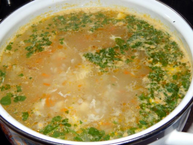 - Το αυγό αναταράσσεται σε ξεχωριστό μπολ και στη συνέχεια χύνεται προσεκτικά στη σούπα σε ένα λεπτό ρεύμα, ανακατεύοντας συνεχώς με ένα χτύπημα. Μόλις το αυγό διασκορπιστεί σε κλωστές, σβήστε τη σόμπα και αφήστε τη σούπα να παρασκευαστεί.