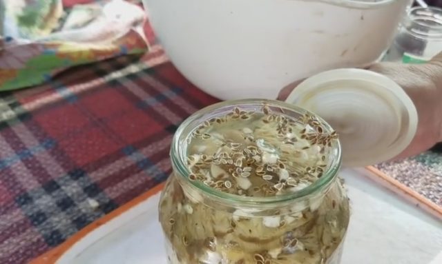 - Ρίξτε αλατόνερο στην κορυφή, αφήστε τον αέρα με ένα πιρούνι, σφίξτε τα καπάκια, στείλτε το στην αποθήκη.