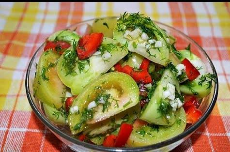 Κόψτε τις ντομάτες σε φέτες, πιπέρι σε δακτυλίους, ψιλοκόψτε τα χόρτα, περάστε το σκόρδο μέσω της πρέσας. Ανακατεύουμε τα λαχανικά, αφού προσθέσουμε όλα τα άλλα συστατικά. Αφήστε το δωμάτιο να μουλιάσει σε χυμό, καλύπτοντάς το με καπάκι.
