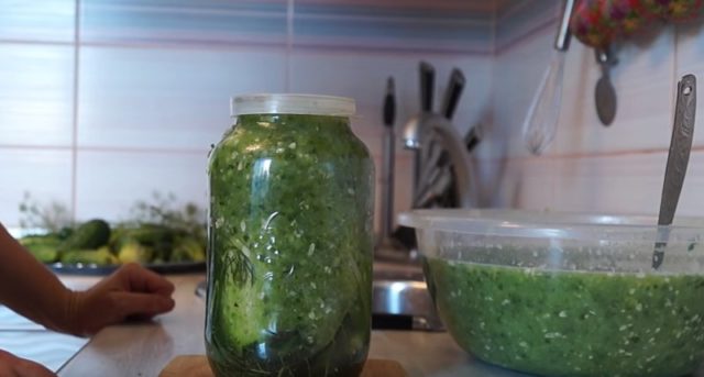 Τα νεαρά δείγματα πλένονται και τοποθετούνται σε βάζο σε όρθια θέση. Τα ώριμα λαχανικά τρίβονται, αναμειγνύονται με αλάτι και το χυλό που προκύπτει χύνεται στον κενό χώρο του βάζου. Ένα νάιλον καπάκι τοποθετείται πάνω και αριστερά σε δροσερό μέρος για να ξεκινήσει η διαδικασία ζύμωσης. Μετά από 3 ημέρες, τα αγγούρια είναι εντελώς έτοιμα για κατανάλωση, τυλίγονται και τοποθετούνται στο ντουλάπι για το χειμώνα.