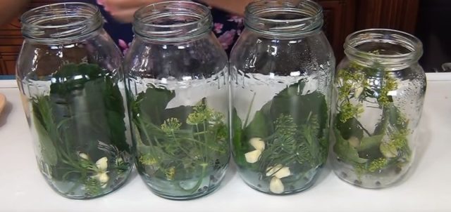 - Ο άνηθος και ολόκληρα γαρίφαλα σκόρδου σε ποσότητα 4-5 τεμαχίων τοποθετούνται στο κάτω μέρος των αποστειρωμένων γυάλινων βάζων.