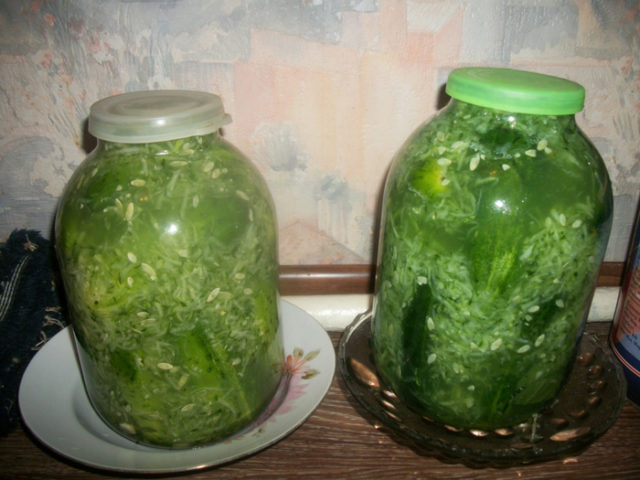 - Τα αγγούρια τοποθετούνται στην κορυφή σε όρθια θέση και καλύπτονται με σταφύλια, μετά την οποία ο όγκος γεμίζει με κουάκερ αγγουριού με την προσθήκη αλατιού.