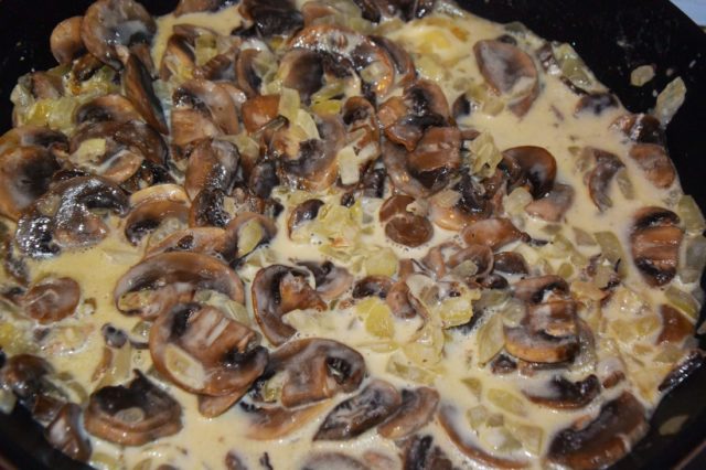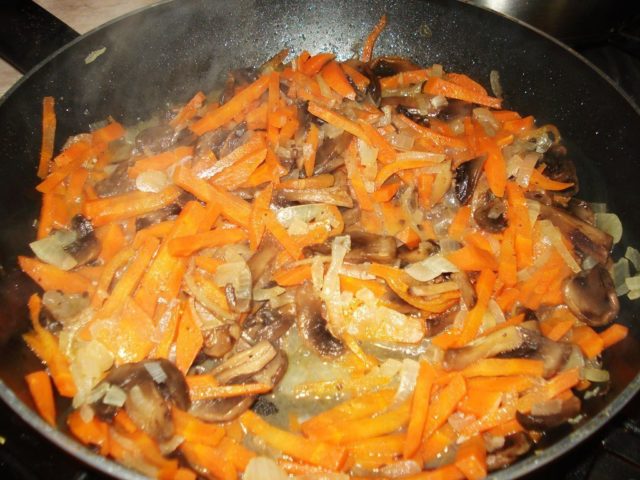 - Τηγανίζουμε τα ψιλοκομμένα κρεμμύδια σε φυτικό λάδι μέχρι να ροδίσουν. Προσθέστε βραστά μανιτάρια στο τηγάνι και σιγοβράστε το μείγμα σε χαμηλή φωτιά για 15 λεπτά.