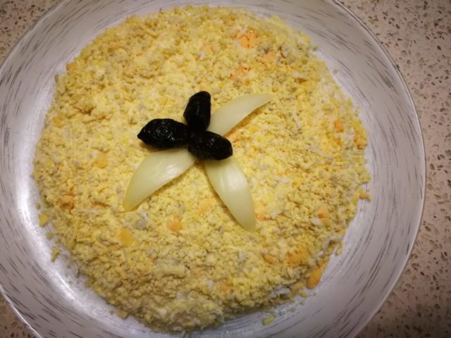 - Ετοιμάστε μια φρουτοσαλάτα με αυτόν τον τρόπο: επικαλύψτε ένα στρώμα μανιταριών με μαγιονέζα, απλώστε ένα στρώμα τριμμένης πρωτεΐνης. Κάθε στρώση πρέπει να επικαλύπτεται ελαφρά με μαγιονέζα. Τοποθετήστε ένα στρώμα τυριού πάνω από το ασπράδι στρώμα. Πασπαλίζουμε την κορυφή της σαλάτας με τριμμένο κρόκο.
