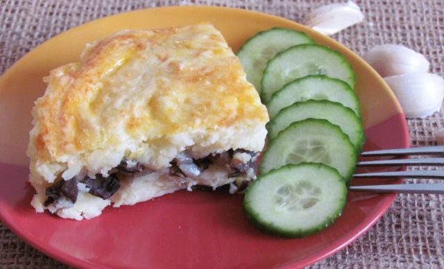 - Λιπάνετε ένα ταψί με λάδι. Απλώστε τις μισές πατάτες πουρέ. Καλύψτε με μαγιονέζα και προσθέστε έτοιμα μανιτάρια και κρεμμύδια. Απλώστε το άλλο μισό των πατατών στην κορυφή.