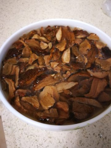 - Το πρώτο βήμα στο μαγείρεμα είναι να μουλιάσετε τα ξηρά συστατικά για 1 έως 2 ώρες. Στραγγίστε το νερό στο οποίο ήταν εμποτισμένο. Ρίχνουμε φρέσκο νερό σε μια κατσαρόλα και μαγειρεύουμε τα μανιτάρια για μισή ώρα.