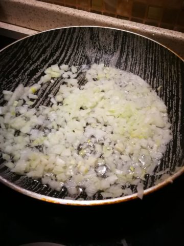 - Τηγανίζουμε το ψιλοκομμένο κρεμμύδι μέχρι να ροδίσει σε ένα τηγάνι σε φυτικό λάδι.