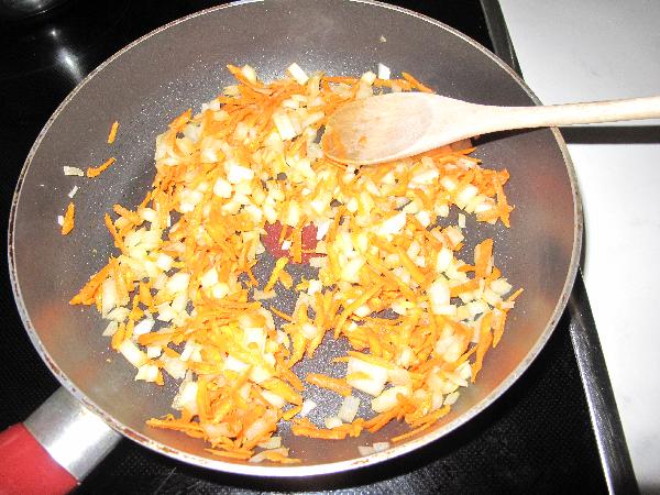 - Βάλτε τα τριμμένα καρότα σε μια κατσαρόλα με κρεμμύδια, σεζόν με πιπέρι. Μαρίδα.