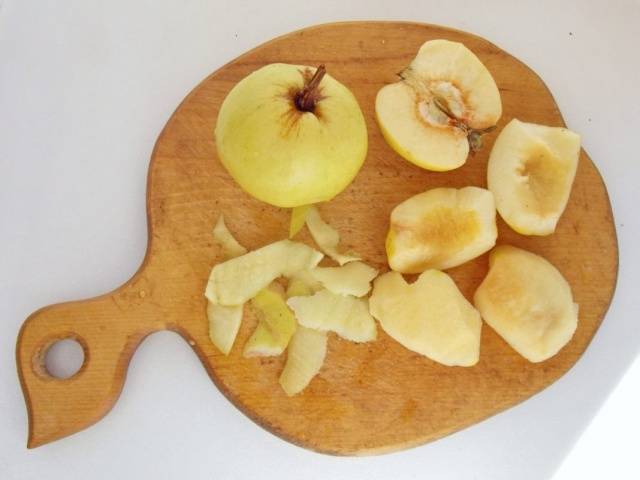 - Το κυδώνι πλένεται πρώτα και μετά ξηραίνεται. Μετά από αυτό, είναι απαραίτητο να ξεφλουδίσετε τα φρούτα αφαιρώντας τη φλούδα και τους σπόρους από αυτά. Οι καθαρισμοί που προκύπτουν δεν χρειάζεται να απορριφθούν, καθώς θα εξακολουθούν να είναι χρήσιμοι για μαρμελάδα.