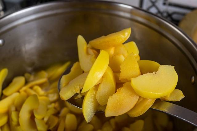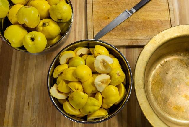 - Μετά από αυτό, το κυδώνι κόβεται σε κομμάτια, το μέγεθος και το σχήμα του οποίου εξαρτάται εξ ολοκλήρου από τις προτιμήσεις της οικοδέσποινας.