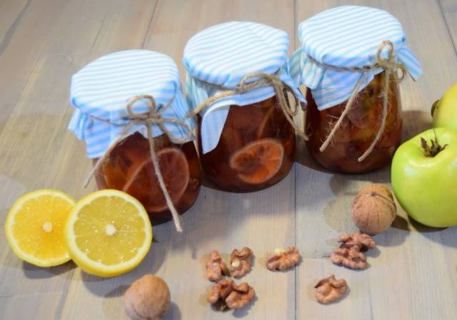 - Αυτή τη στιγμή, ο καθαρισμός που ελήφθη νωρίτερα, ρίχνουμε 500 ml νερού και βράζουμε για περίπου επτά λεπτά σε χαμηλή φωτιά. Πριν από το τελευταίο μαγείρεμα, ο φιλτραρισμένος ζωμός από τους καθαρισμούς χύνεται σε μια κατσαρόλα με μαρμελάδα. Αυτό θα δώσει στη μαρμελάδα μια ισχυρή γεύση. Ταυτόχρονα, είναι απαραίτητο να προσθέσετε ψιλοκομμένα καρύδια (μπορούν να κοπούν με ένα μαχαίρι ή να τεμαχιστούν με έναν πλάστη), τα μέρη των οποίων δεν πρέπει να είναι πολύ μικρά.