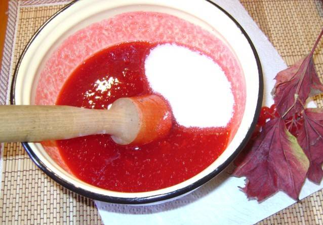 Σε ένα τέτοιο προϊόν, όλες οι θεραπευτικές ουσίες διατηρούνται όσο το δυνατόν περισσότερο. Για να προετοιμάσετε ένα νόστιμο παρασκεύασμα, θα χρειαστείτε την ίδια ποσότητα ζάχαρης για κάθε ποτήρι χυμό πουρέ με πολτό. Τα οστά Viburnum είναι σκληρά και πολύ πικρά, επομένως θα πρέπει να αφαιρεθούν. Για αυτό, τρίβονται τα μούρα. Αυτή η διαδικασία είναι αρκετά επίπονη. Αλλά δεν είναι κρίμα να δουλεύεις σκληρά για να φτιάξεις νόστιμο και υγιεινό ζελέ.