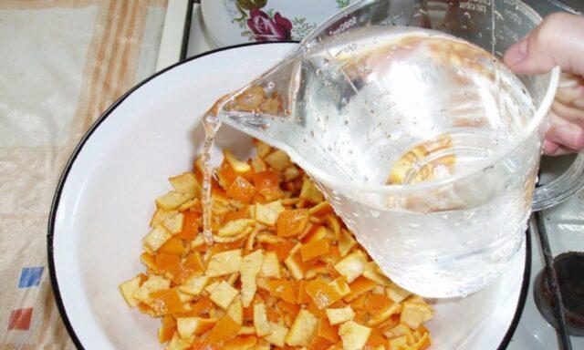 Στη συνέχεια, κόψτε τις φλούδες μανταρίνι σε λωρίδες ή κομμάτια. Διπλώστε την προκύπτουσα μάζα σε μια λεκάνη σμάλτου και γεμίστε με συνηθισμένο νερό για 5-6 ώρες. Το υγρό πρέπει να αλλάξει τρεις έως τέσσερις φορές για να απομακρυνθεί η πίκρα από τις κρούστες. Μόνο τότε μπορείτε να αρχίσετε να μαγειρεύετε απευθείας.