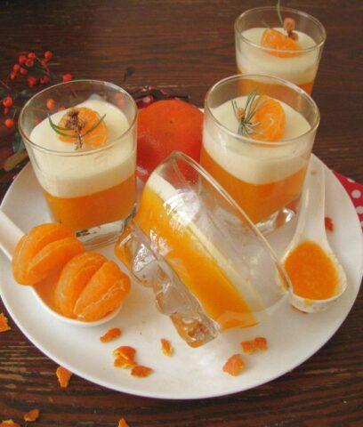 Όταν το ανώτερο στρώμα πυκνωθεί, γαρνίρετε με φέτες μανταρίνι και σερβίρετε.