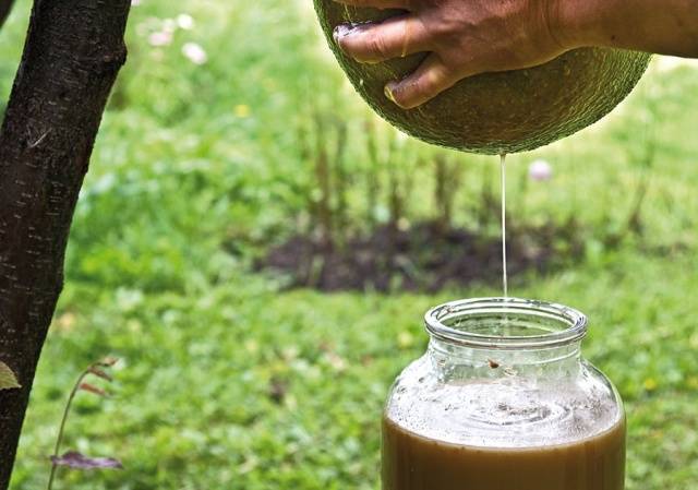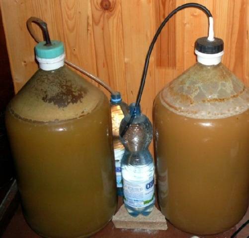 - Ο χυμός απομακρύνεται από το ίζημα και χύνεται σε ένα δοχείο όπου θα πραγματοποιηθεί η ζύμωση. Ένα δοχείο νερού τοποθετείται στο δοχείο.