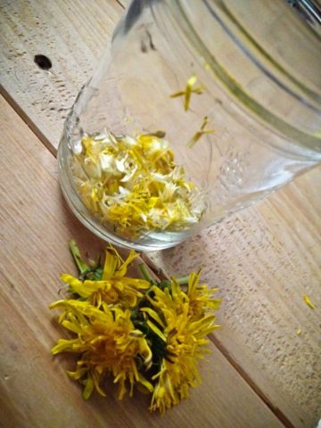 - Βάλτε τα κίτρινα πέταλα πικραλίδας σε ένα μπολ σμάλτου, ρίξτε βραστό νερό και αφήστε το να σταθεί για μια μέρα κάτω από το καπάκι.